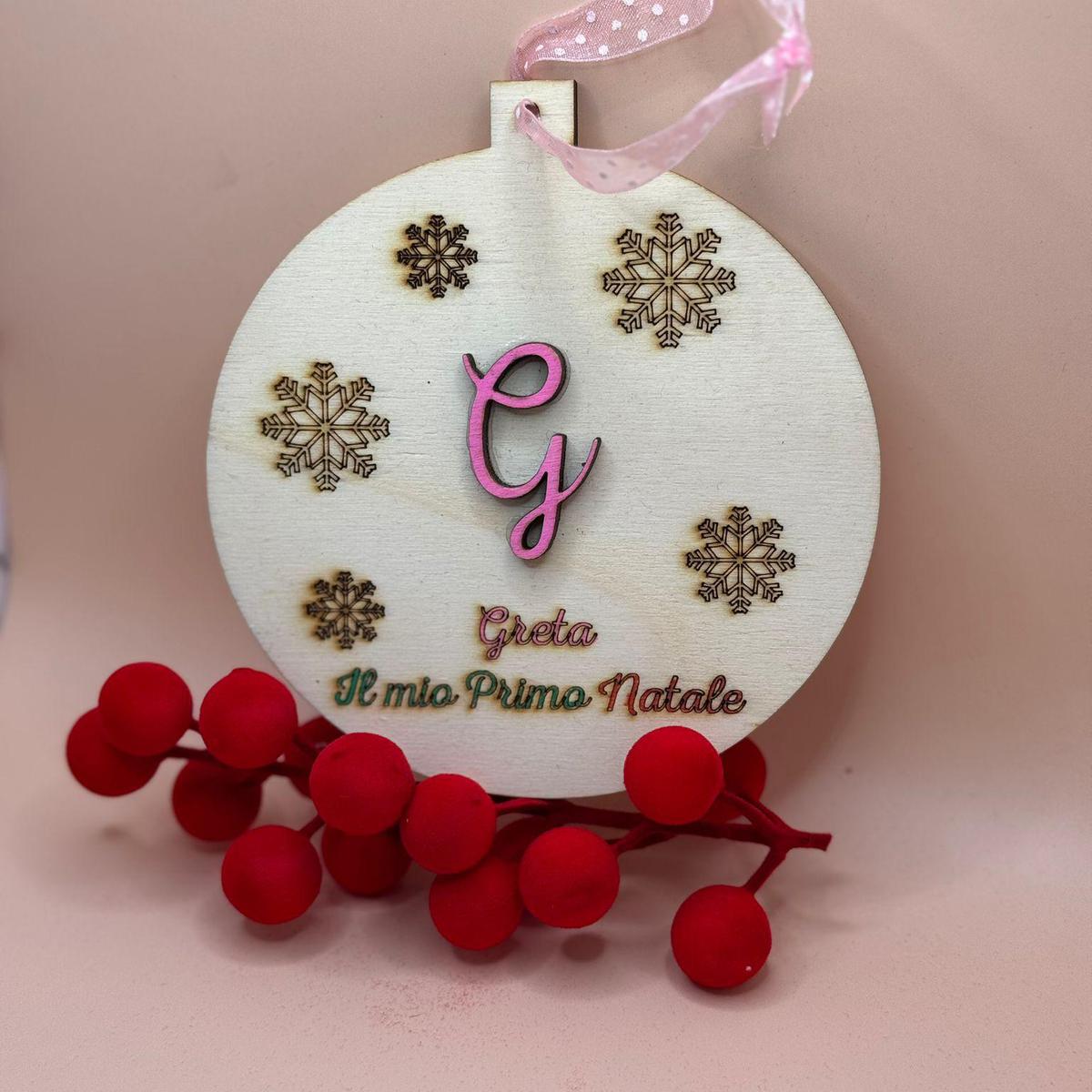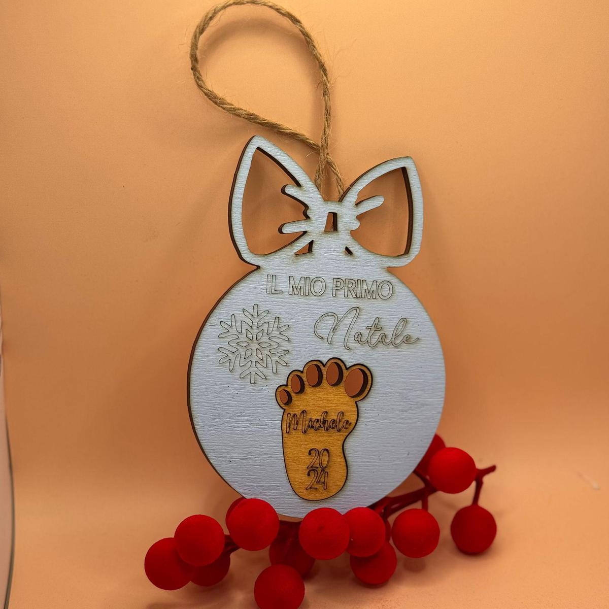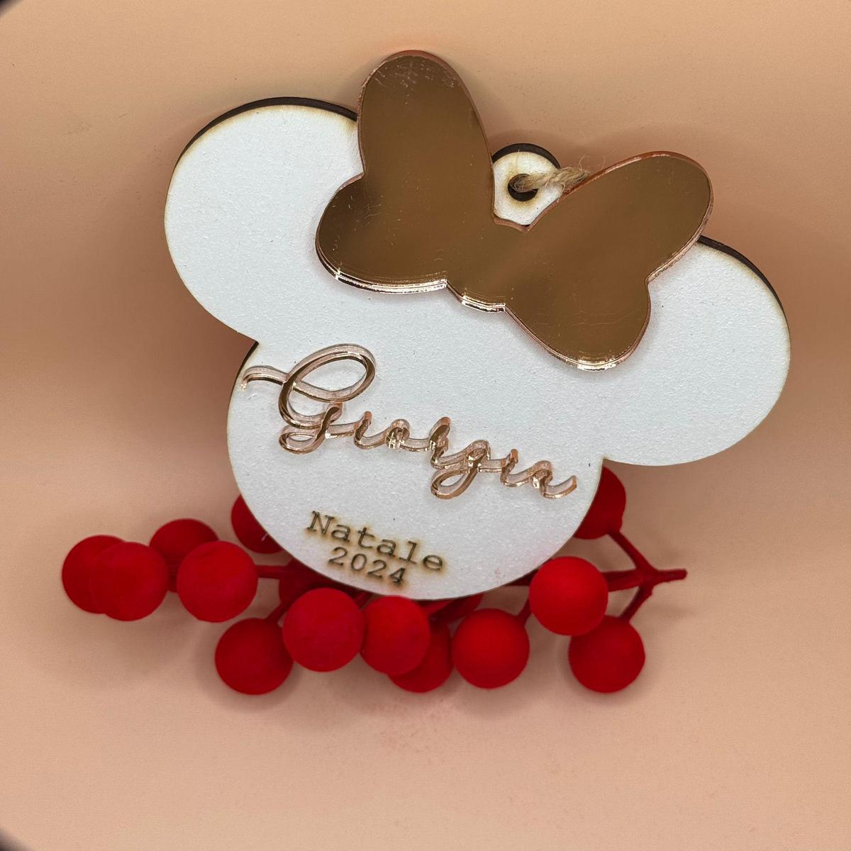 Decorazione in plexiglass a forma di pacco regalo, con personaggio natalizio e nome personalizzato in oro. Dotato di cordino per appenderla